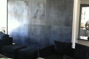 Walls coated in venetian plaster. Color was chosen to coordinate with wall prints.