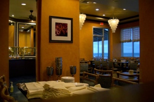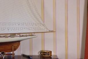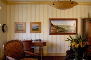 Hand painted stripe at wall to coordinate with chair fabric. Stripe is glazed lightly, adding character and depth. Ceiling painted and glazed.