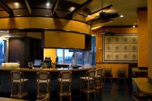 Bar header hand painted using linen texture technique. Walls coated with Spatula Stuhhi venetian plaster and wax.