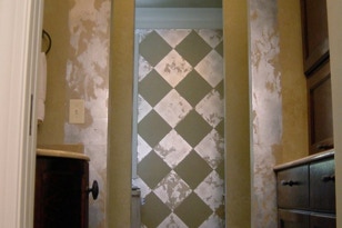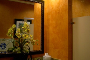 His and hers bathrooms. Distressed metal leaf with soft warm glaze.