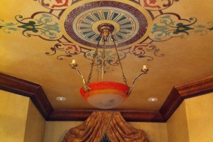 Walls and ceiling warm glaze. Hand painted stencil at ceiling light fixture.
